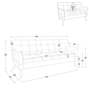 I piedi in legno di faggio garantiscono stabilità ed eleganza, mentre il piede di appoggio supplementare centrale assicura una maggiore resistenza strutturale e un’ottima distribuzione del peso. Il divano supporta un carico massimo fino a 380 kg, risultando robusto e affidabile. Dimensioni: 190 x 73 x 78 cm. Fornito in confezione singola.