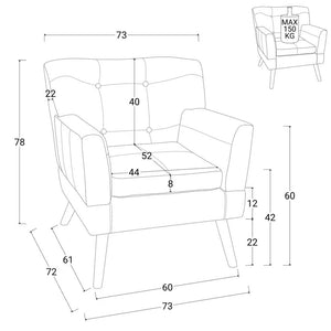 I piedi in legno di faggio garantiscono stabilità ed eleganza. Il divano supporta un carico massimo fino a 150 kg, risultando robusto e affidabile. Dimensioni: 73 x 72 x 78 cm. Fornito in confezione singola.