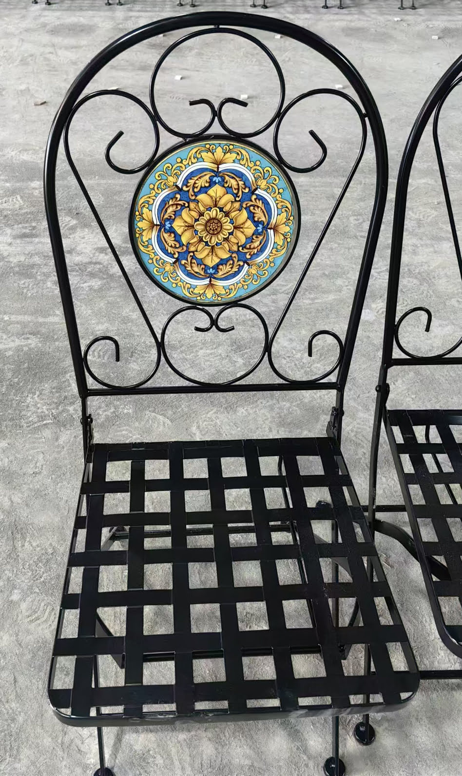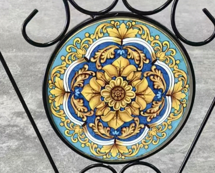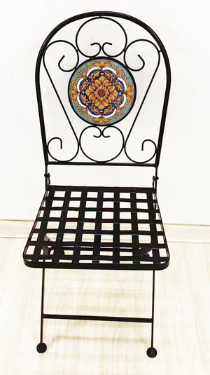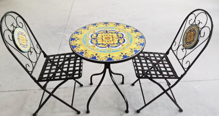 MOKIT26 Tavolo rotondo altezza 70 cm. circa, in ferro battuto lavorato a mano con Superficie a mosaico in ceramica artistica fissata con procedimento a fuoco, diametro 60 cm. completo di 2 sedie pieghevoli anche esse in ferro battuto riportanti sullo schienale lo stesso soggetto del tavolino, modelli realizzati in edizione limitata di 100 pezzi a soggetto.