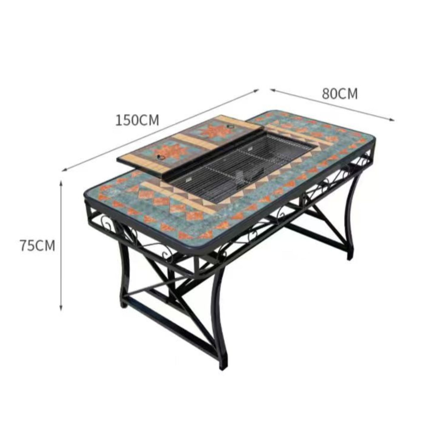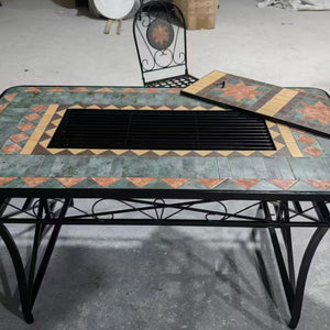 MOKIT020 Tavolo rettangolare altezza 150x80 cm. circa in ferro battuto lavorato a mano con superficie a mosaico in ceramica artistica fissata con procedimento a fuoco e parte centrale estraibile per uso griglia, completo di 4 sedie pieghevoli anche esse in ferro battuto , riportanti sullo schienale lo stesso soggetto, modello realizzato in edizione limitata di 100 set.