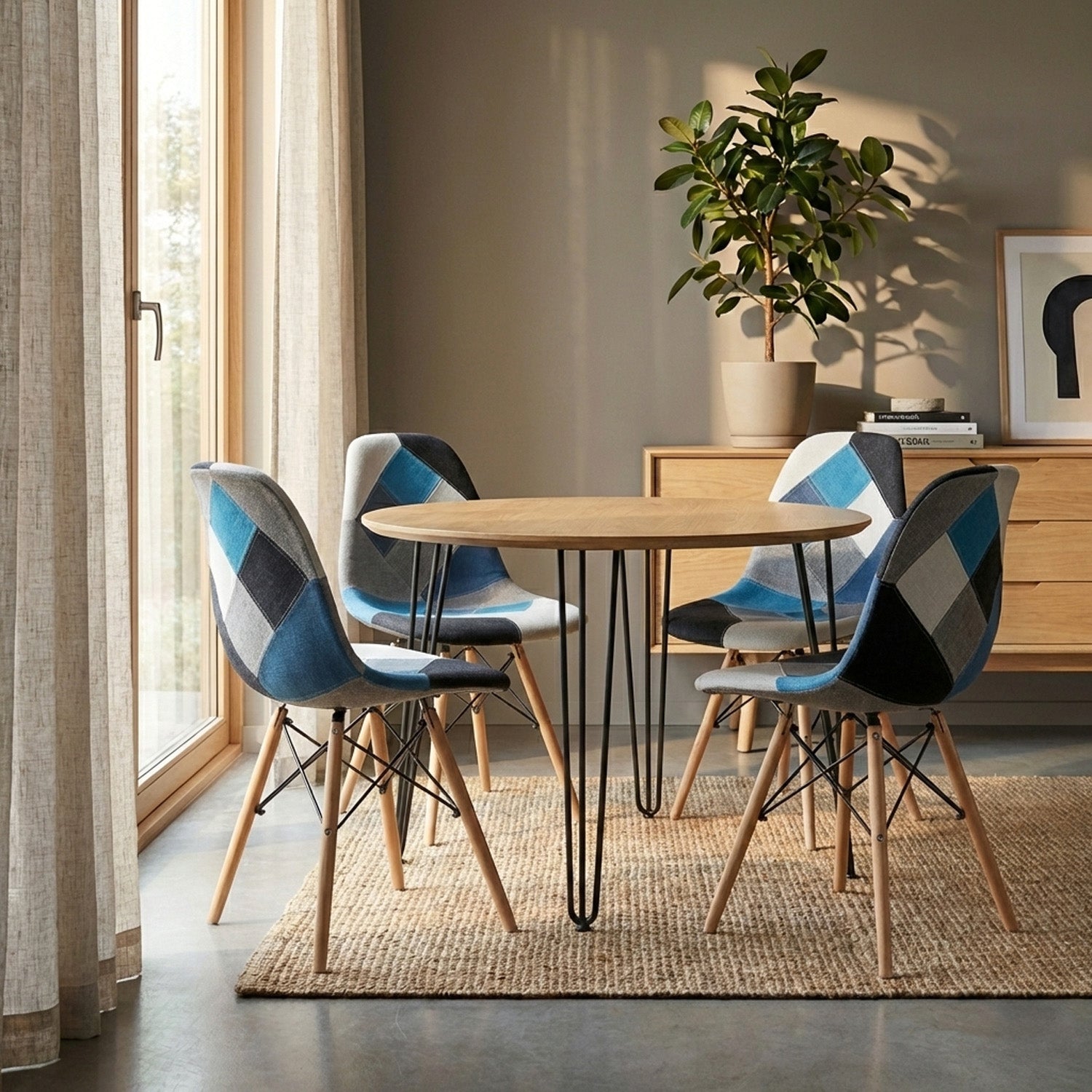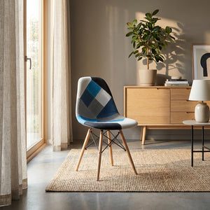 Porta stile e comfort nei tuoi ambienti con questa elegante sedia dal design moderno. Realizzata con struttura in PP resistente, è dotata di una seduta imbottita in spugna e rivestita in stoffa patchwork cucita a mano da esperti artigiani, che rende ogni pezzo unico e ricco di personalità.