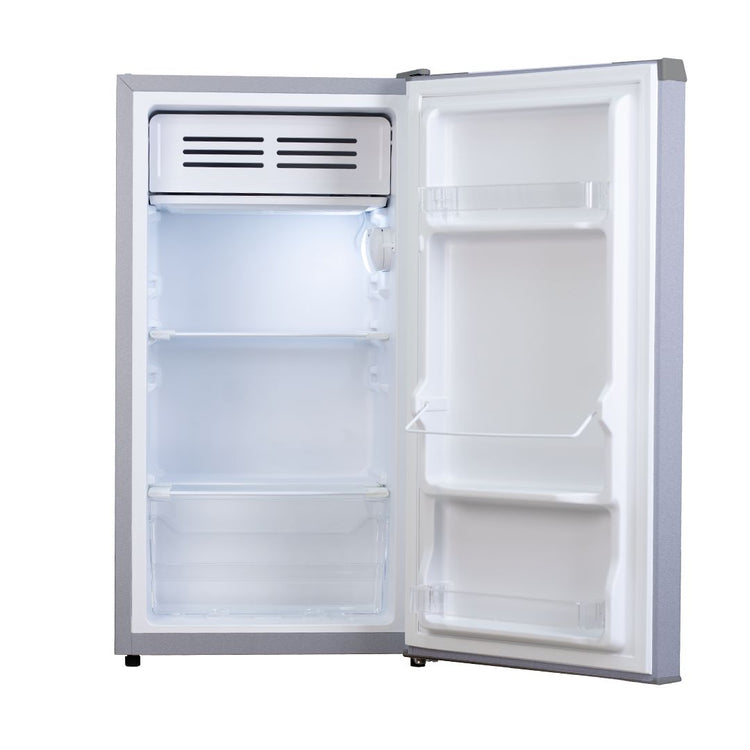 Capacità 100 litri lordi (Frigo 80 litri + Freezer 10 litri),Colore Silver, classe energetica E, Range temperatura 0°/10° (scomparto freezer -6°/0°), un ripiano, un balconcino interno, porta reversibile, piedini regolabili, vassoio per il ghiaccio, gas refrigerante R600A, Voltaggio 220-240V/50Hz, Dimensioni (LxPxH) - 44.4 x 45.6 x 85 cm