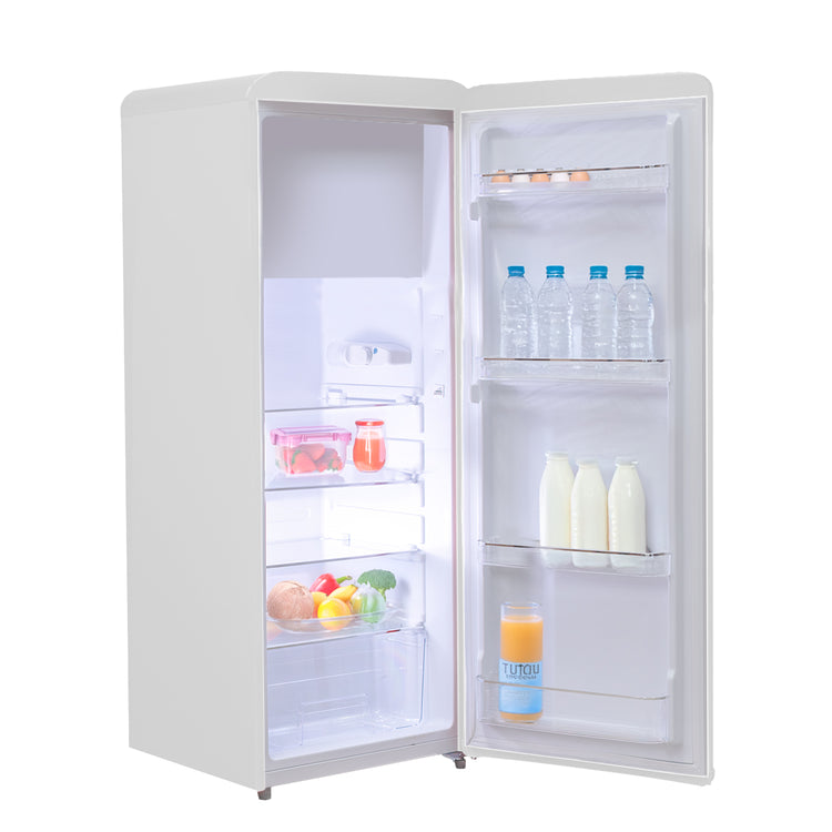 Ripiani rimovibili e cassetto frutta e verdura: dotato di 3 ripiani rimovibili, posizionabili su vari livelli, regolabili per adattarsi alle tue esigenze di conservazione. Il cassetto frutta e verdura aiuta a preservare l'umidità per frutta e verdura, mantenendole succose e fresche. Porta con balcone per bottiglie e balcone piccolo in alto.