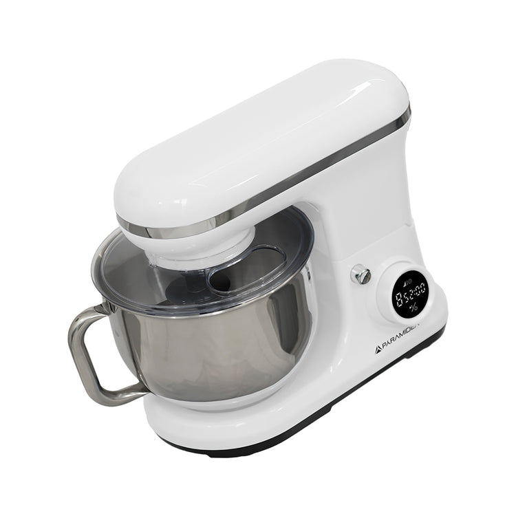 Impastatrice con display digitale, 8 velocità , Timer digitale, Testa sollevabile, potenza 1200 watt max, 6 velocità di rotazione planetaria, funzione pulse, ciotola in acciaio 5,2 litri, Coperchio paraschizzi,sbattitore in acciaio, Gancio impastatore, sbattitore IN TEFLON, Colore Bianco, Misure 25X33X37,5