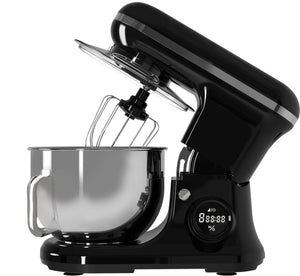 Impastatrice con display digitale, 8 velocità , Timer digitale, Testa sollevabile, potenza 1200 watt max, 6 velocità di rotazione planetaria, funzione pulse, ciotola in acciaio 5,2 litri, Coperchio paraschizzi,sbattitore in acciaio, Gancio impastatore, sbattitore IN TEFLON, colore NERO, Misure 25X33X37,5