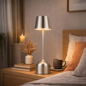 Lampada da Tavolo con ricarica USB, 3 temperature colore: Luca calda, fredda o naturale, 3 livelli di luminosità, fino a 30 ore di funzionamento continuo, regolazione luminosità su 3 livelli predefiniti per regolare in maniera uniforme un gruppo di lampade. Ricarica 3 ore, corpo in alluminio, batteria max 2000 mah, durata media lampada >10.000 ore, potenza 2 Watt, altezza 37,5 cm. , Cavo ricarica USB C incluso.