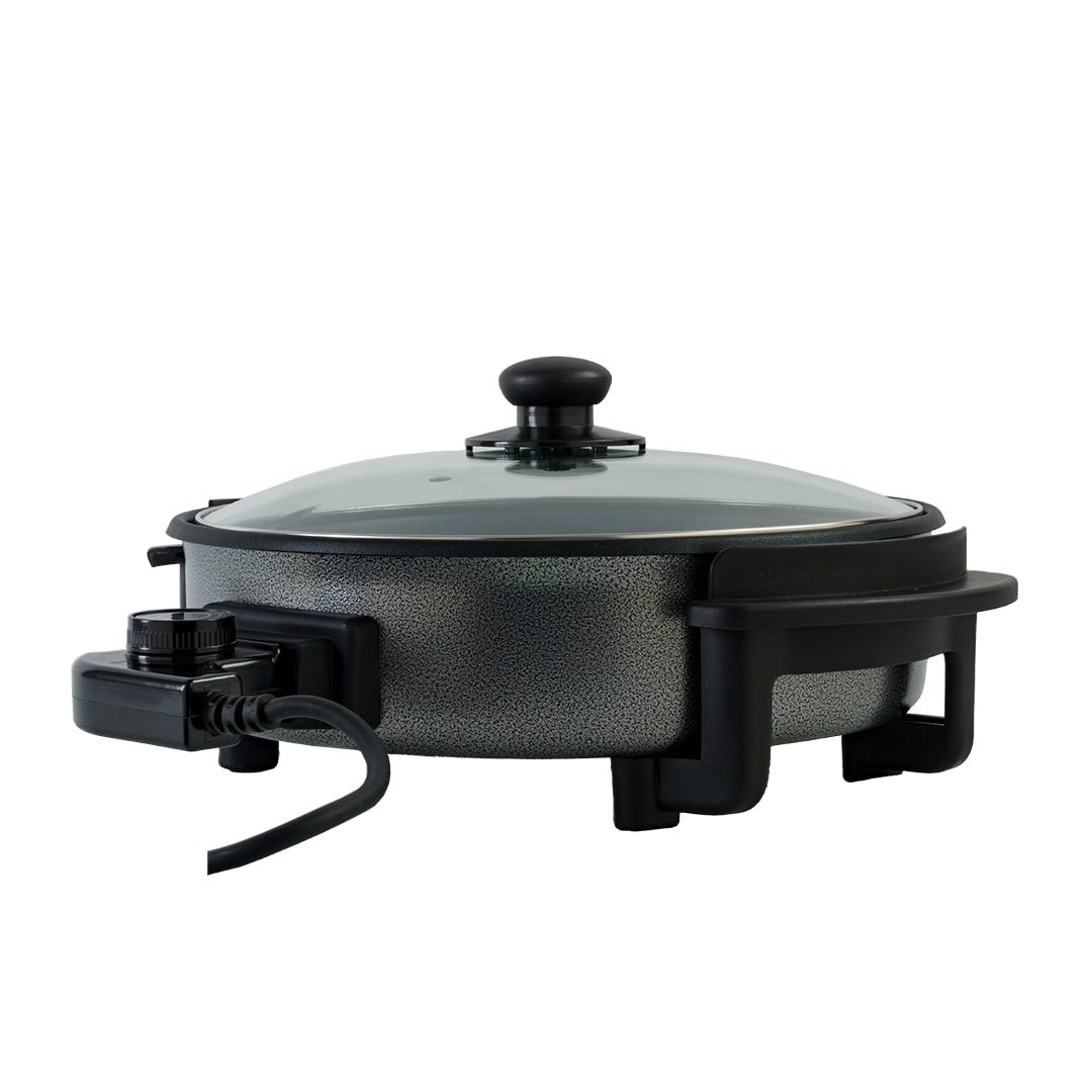 Con termostato regolabile, maniglia antiscottamento e superficie antiaderente. La copertura trattieni calore permette una cottura omogenea ed evita il raffreddamento del piatto. Lo strumento perfetto per più cotture come grigliate, dolci, paella e pizza.